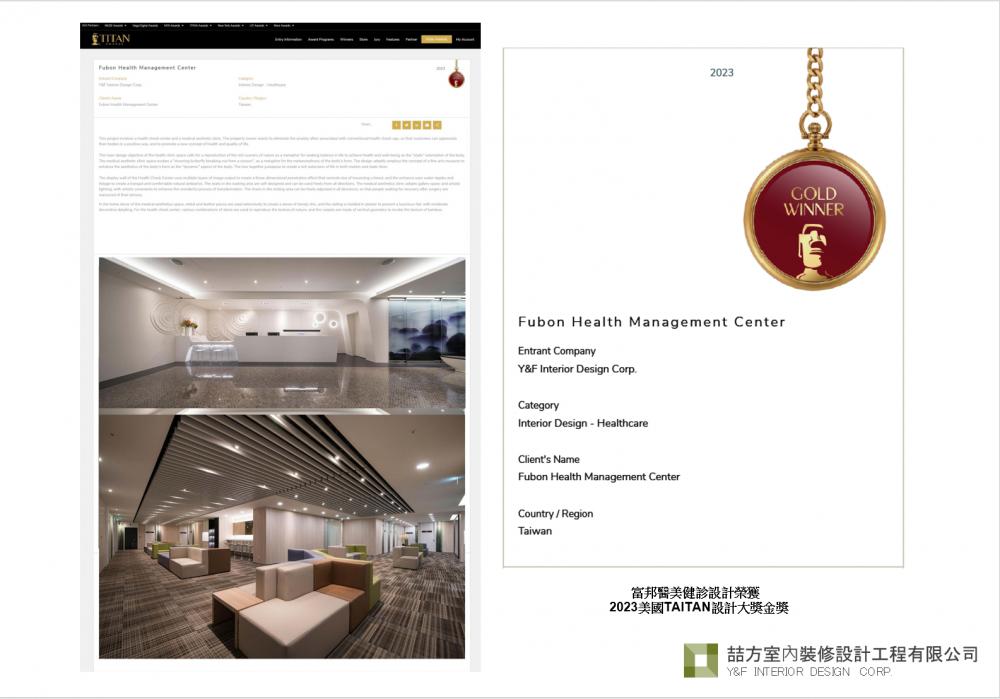 富邦醫美健診設計榮獲2023美國TAITAN設計大獎金獎 2026-01-06 20:54 富邦醫美健診設計榮獲2023美國TAITAN設計大獎金獎 | Y&F 喆方設計 | 全方位室內設計服務 Y&F INTERIOR DESIGN NEWS