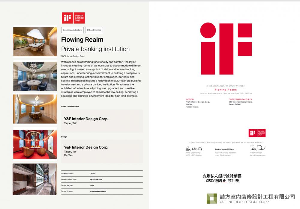 兆豐私人銀行設計榮獲2025德國iF設計獎 2026-01-06 20:57 兆豐私人銀行設計榮獲2025德國iF設計獎 | Y&F 喆方設計 | 全方位室內設計服務 Y&F INTERIOR DESIGN NEWS
